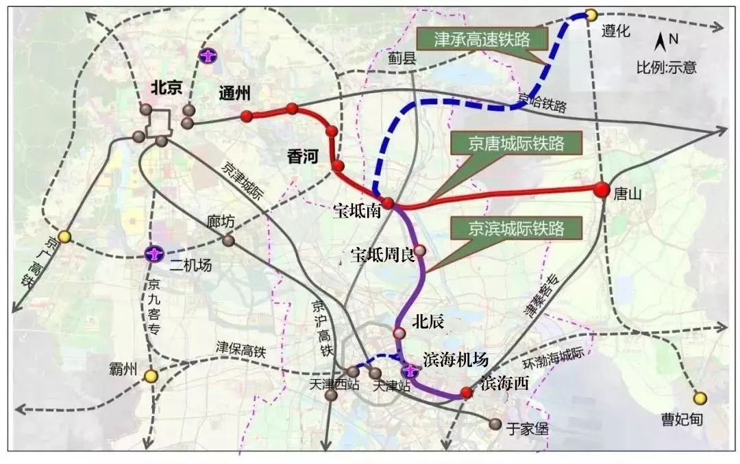 京滨铁路起自宝坻南站,终至滨海西站,与京唐铁路共同构成京津之间的第3条高铁通道。线路长度约97公里,总投资238亿元,全线共设置宝坻南、宝坻周良、北辰、滨海机场、滨海西5座车站。京滨铁路建成后,北京直达天津滨海新区只需57分钟,从宝坻南站到北京站仅需18分钟,宝坻到天津机场只需15分钟。